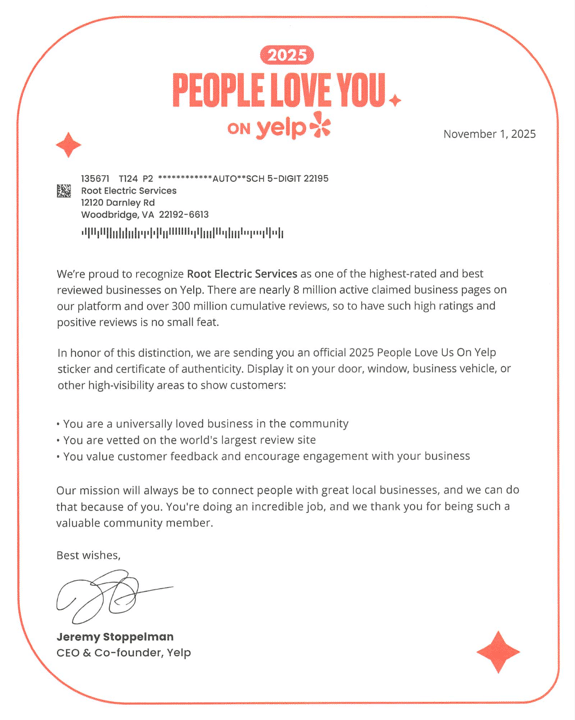 🌟 Root Electric Is Proud to Be Honored by Yelp in 2025!